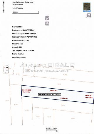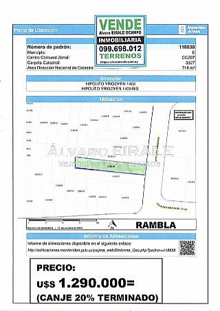 FRENTE AL MAR y RAMBLA DE MALVIN : HIPOLITO YRIGOYEN 1409 casi RAMBLA CON VISTA AL MAR Y ORIENTADO AL ESTE. UBICADO EN EL MEJOR PUNTO DE MALVIN.TERRENO FRENTE al MAR. PADRON UNICO Nº 118.838. METRAJE: 10.00 X 72.00= 718 m2 ALTURA PARA EDIFICAR X ACORDAMIENTO 11 PISOS (HAY PROYECTO CON ALTURAS) SE PUEDE TOMAR EL 20 % DEL PRECIO EN CANJE TERMINADO. *VENDE INMOBILIARIA Álvaro EIRALE OCAMPO 099.698.012 y 094.698.012 (2026.TODOS los TERRENOS) alvaroeirale@gmail.com HTTPS://ALVAROEIRALE.COM.UY Servicios Inmobiliarios en Uruguay desde 1986. Comisión Inmobiliaria 3 % + IVA RUT217892740016